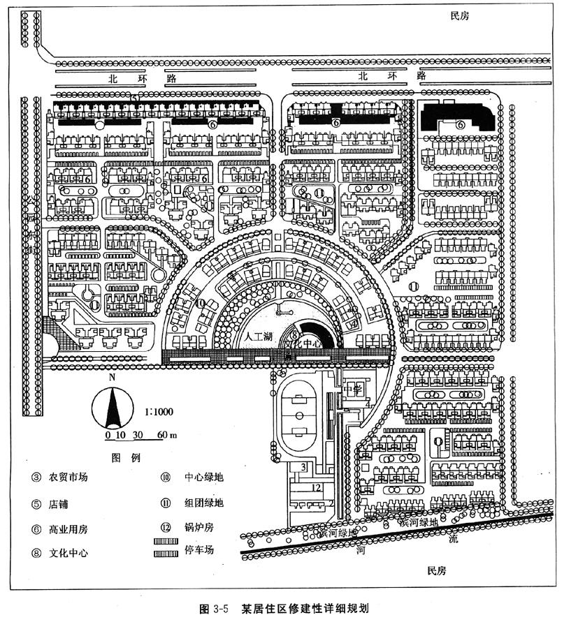小区规划采用了组团小区的结构模式,形成一个中心、三个小区、八个组团、组团向心布置。某居住区修建性详细规划如图3-5所示。
