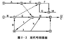 某网络图有A~M共13项工作,其中的工作K是J的前一时段的紧后工作,K又是H后一时段的紧前工作。根据逻辑关系绘出双代号网络图(见图5-2)。其中,节点编号①~⑦是正确的。
